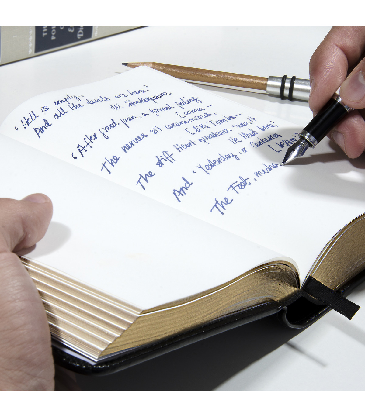 My Bible peut être écrite avec tous les types de stylos, plumes et crayons. Bien que les pages soient légèrement transparentes lorsqu'on utilise des stylos plumes, des feutres ou des stylos gel, il est possible d'écrire des deux côtés. Si vous utilisez un stylo qui nécessite une certaine pression pour écrire, il donnera au papier une texture très particulière.