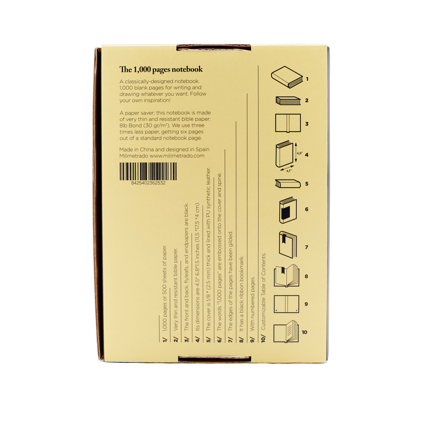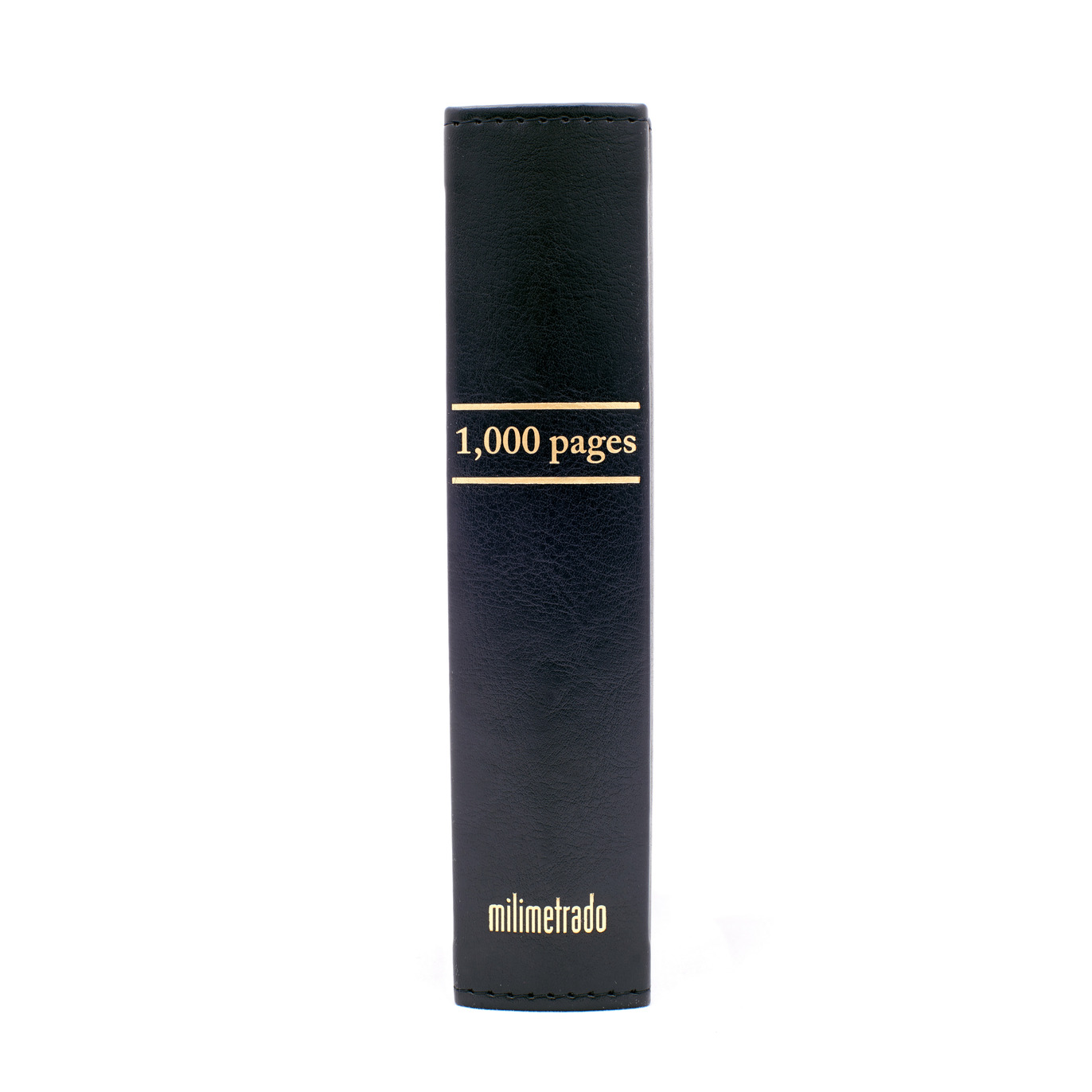 1 000 pages, est-ce beaucoup ? Un cahier normal compte entre 100 et 200 pages, ce qui en fait jusqu'à 10 fois plus ! De plus, comme il est fabriqué avec du papier bible, avec la même quantité de papier, nous obtenons 6 fois plus de pages. C'est un carnet léger et durable : plus de pages, plus fines, et moins d'arbres utilisés pour sa production.