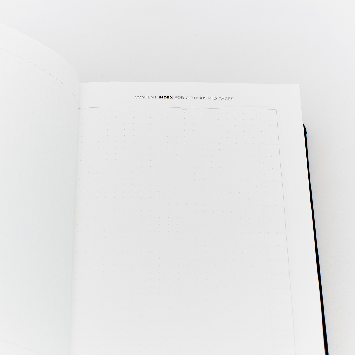 Sur la tranche du carnet, on peut également lire "1000 pages" en doré, ainsi que "Milimetrado", le nom des créateurs de ce fantastique design. Le carnet est également pourvu d'un ruban noir, comme une bible, pour marquer la dernière page ou ne pas oublier où vous avez laissé cette note prodigieuse. Au début, vous trouverez un répertoire de 6 pages qui vous permettra de créer votre propre index et d'organiser le contenu du carnet de manière simple.